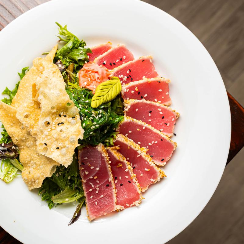 Sesame seared tuna served rare over baby greens with seaweed salad, wasabi, ginger, soy vinaigrette, and crisp wontons.